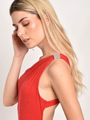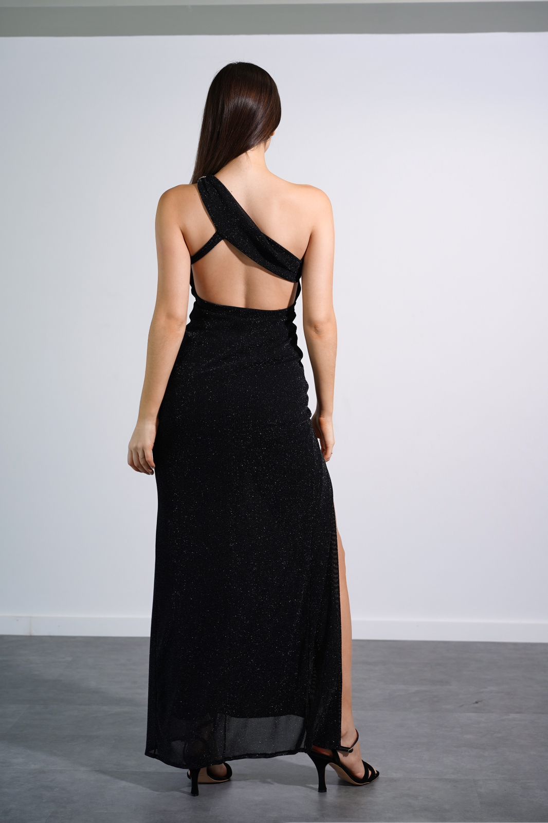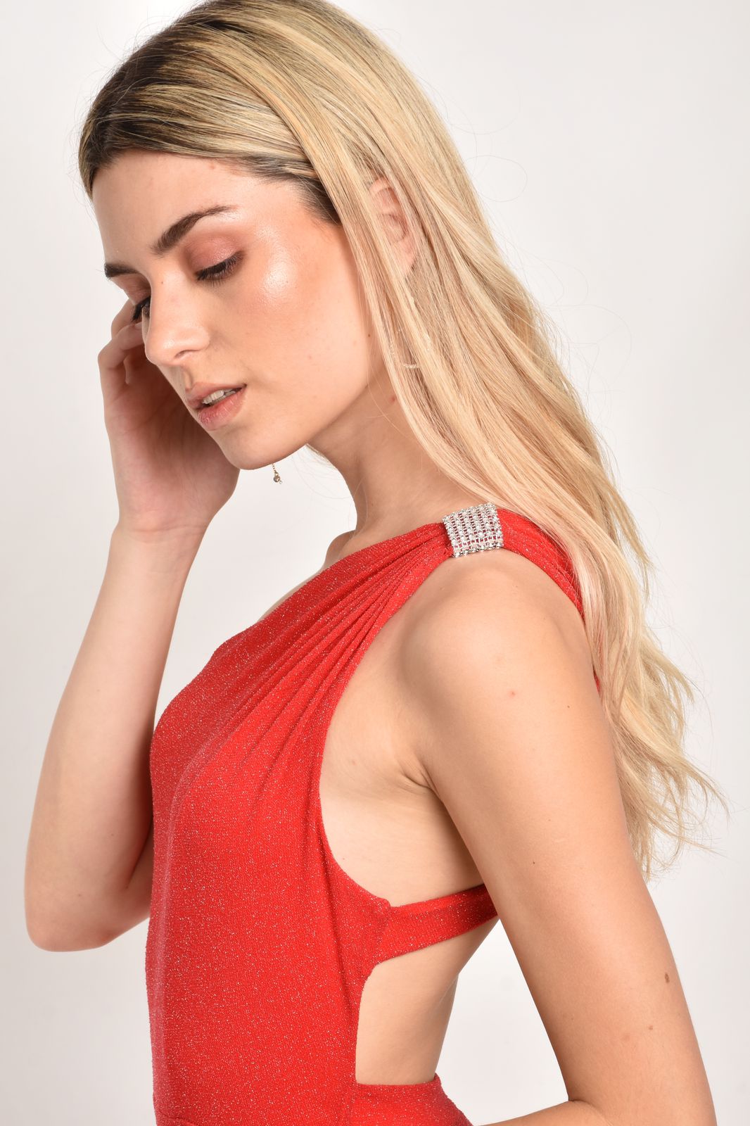 Vestido largo con glitter con strass en el hombro